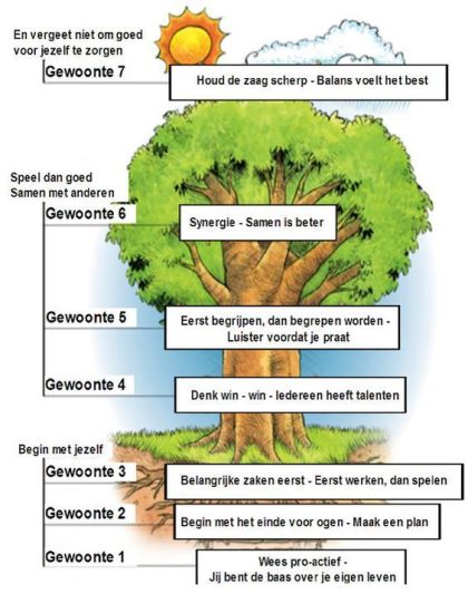 De kruin: tenslotte komt de boom tot volle bloei en groei! En dat kan alleen als je ‘de zaag scherp houdt’! Dat wil zeggen: als je goed voor jezelf zorgt en jezelf voedt, letterlijk en figuurlijk. Mentaal (hoofd), door jezelf te voeden met bijvoorbeeld mooie boeken en muziek, sociaal-emotioneel (hart), door mensen op te zoeken die je lief zijn, of inspireren. Spiritueel (ziel), door te mediteren of rust te vinden in de natuur. En fysiek (lichaam) bijvoorbeeld door te sporten, gezond te eten en op tijd naar bed te gaan. Gewoonte 7 gaat hierover.